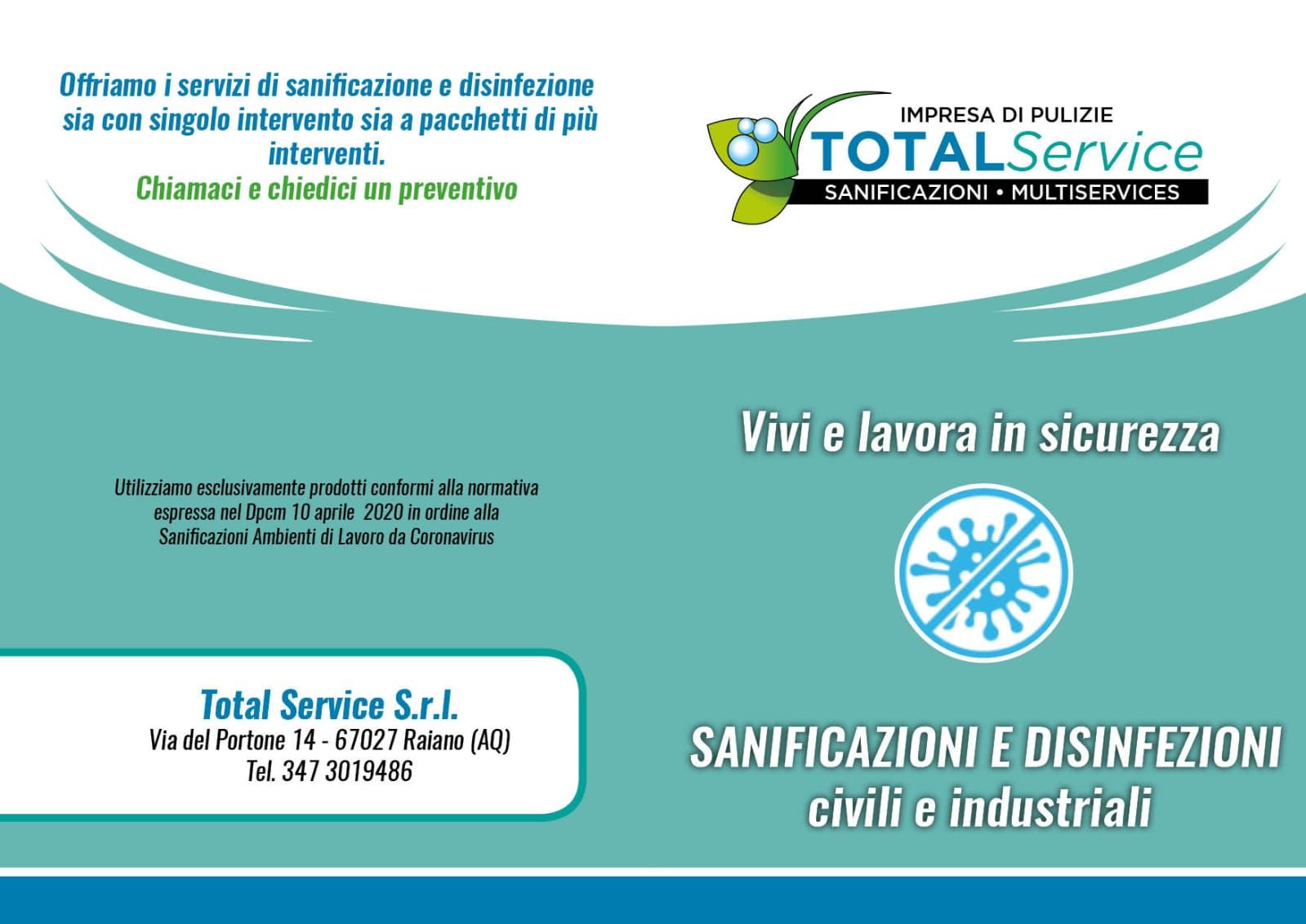 Total Service è agenzia di multiservizi, specializzata in pulizie e sanificazioni civili ed industriali. La ditta si occupa delle pulizie e sanificazioni di abitazioni private, uffici ed edifici industriali. Effettua inoltre servizi di giardinaggio e riparazione infissi a Raiano e in provincia de L'Aquila. Total Service offre sopralluoghi e preventivi senza impegno al fine di garantirti piena libertà di scelta in base alle tue necessità.